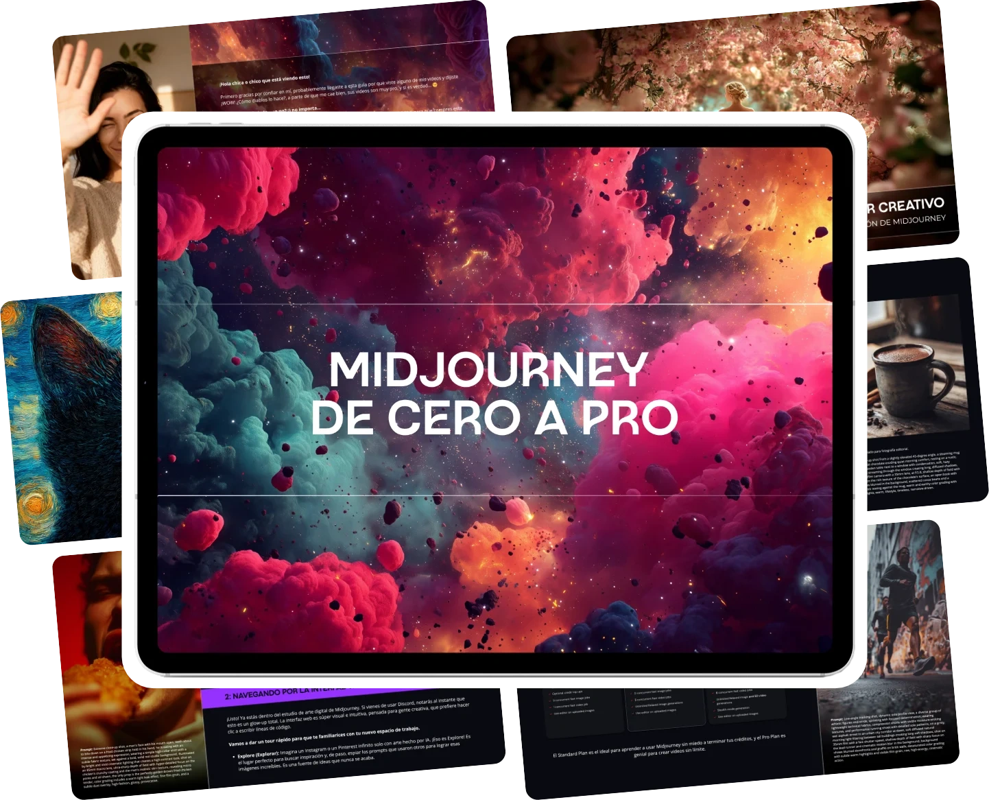 Midjourney de Cero a Pro es como tener a un amigo súper paciente (que casualmente es un pro en Midjourney) explicándote paso a paso y con detalle cómo transformar tus ideas en imágenes.