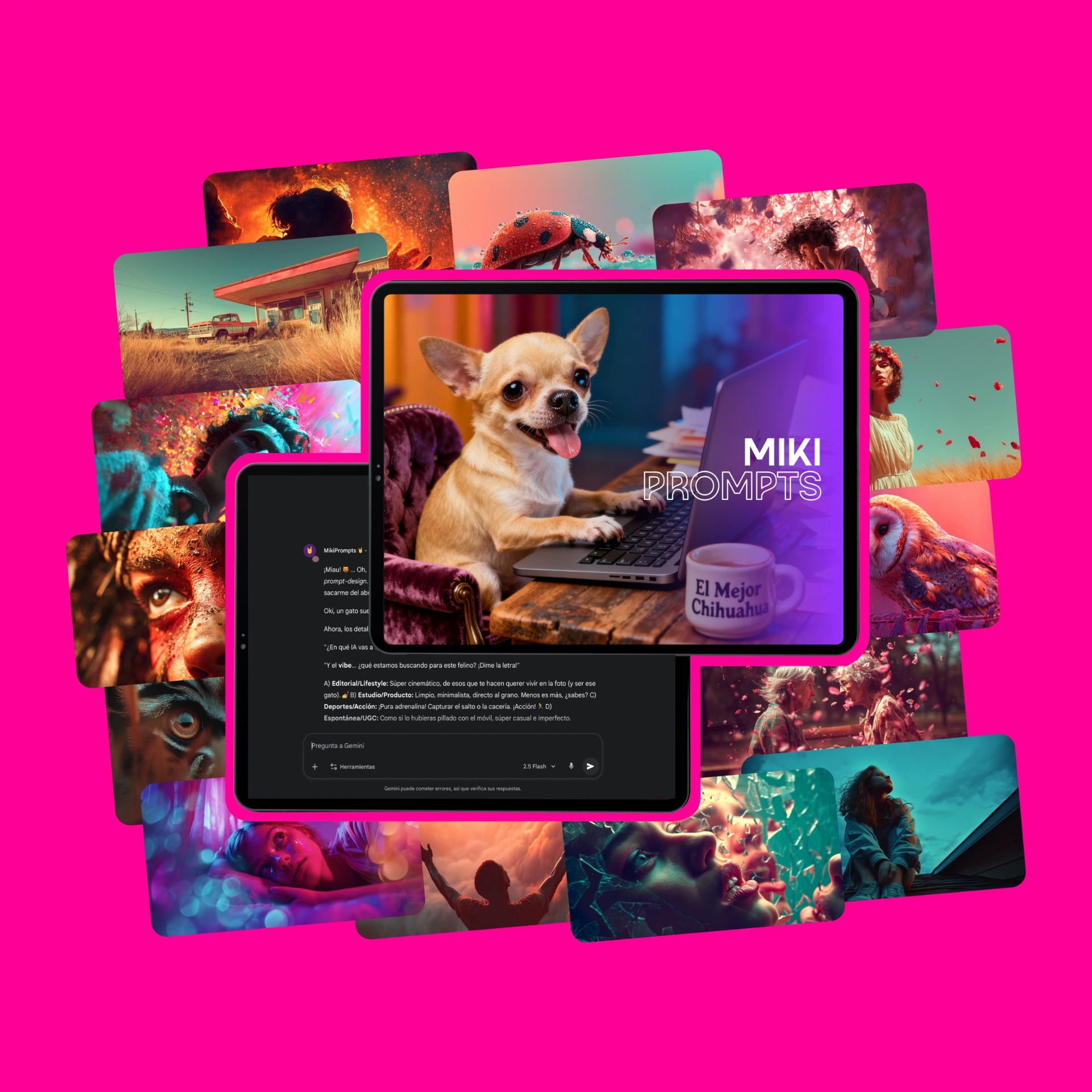 - BONO #1: MIKIPROMPTS: Tu asistente creativo en esteroides. Convierte tus ideas básicas («Un gato sentado en una mesa») en descripciones hiper detalladas y estéticas para crear una obra maestra al instante.